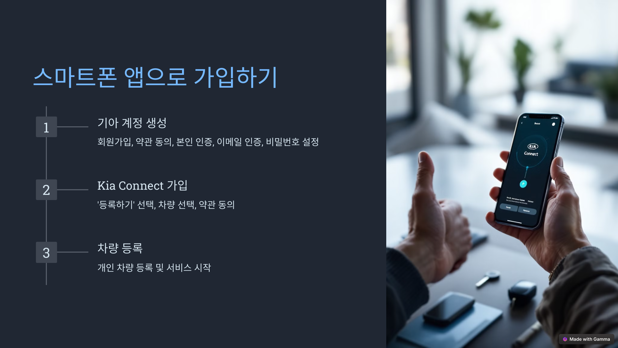 Kia Connect는 스마트폰 앱과 차량 내비게이션을 통해 간편하게 가입할 수 있습니다. 아래 단계에 따라 진행해 보세요: