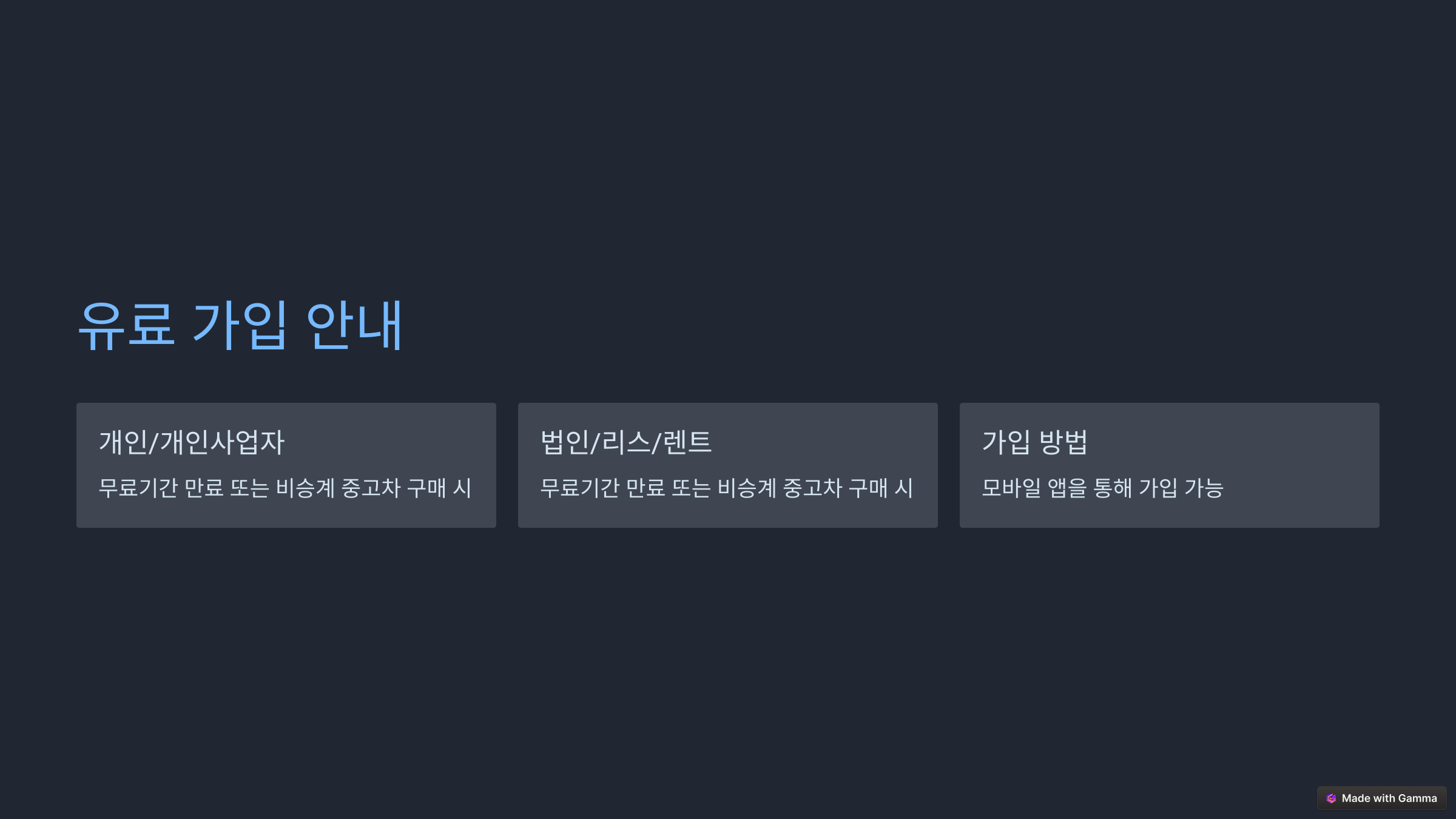 - **법인/리스/렌트 차량**: 법인 사용자도 모바일 앱을 통해 유료 가입 가능하며, 차량 실 사용자로 서비스 이용 가능.