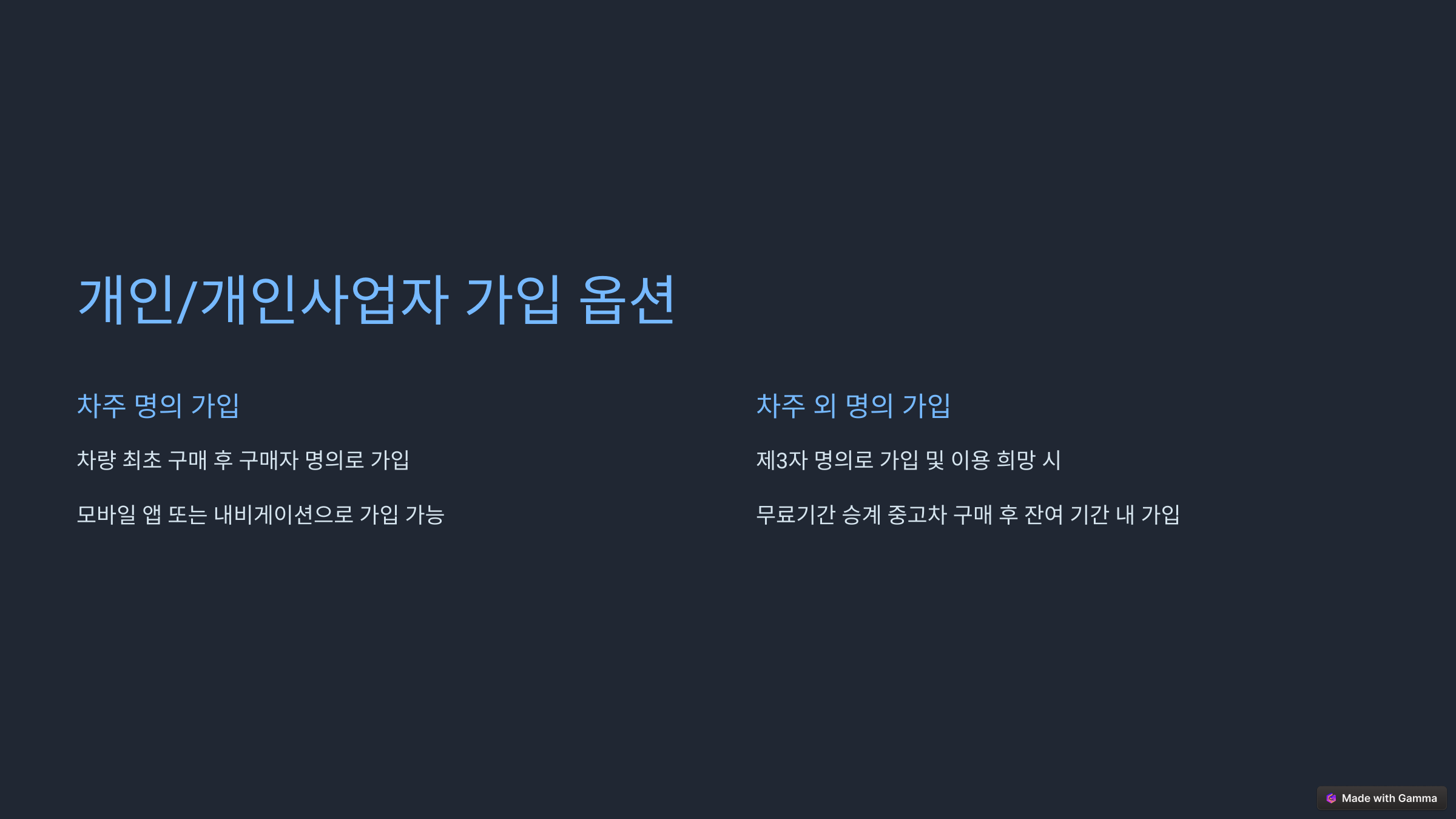 - **차주 명의로 가입**: 차량 최초 구매자 명의로 모바일 앱이나 내비게이션을 통해 가입 가능.