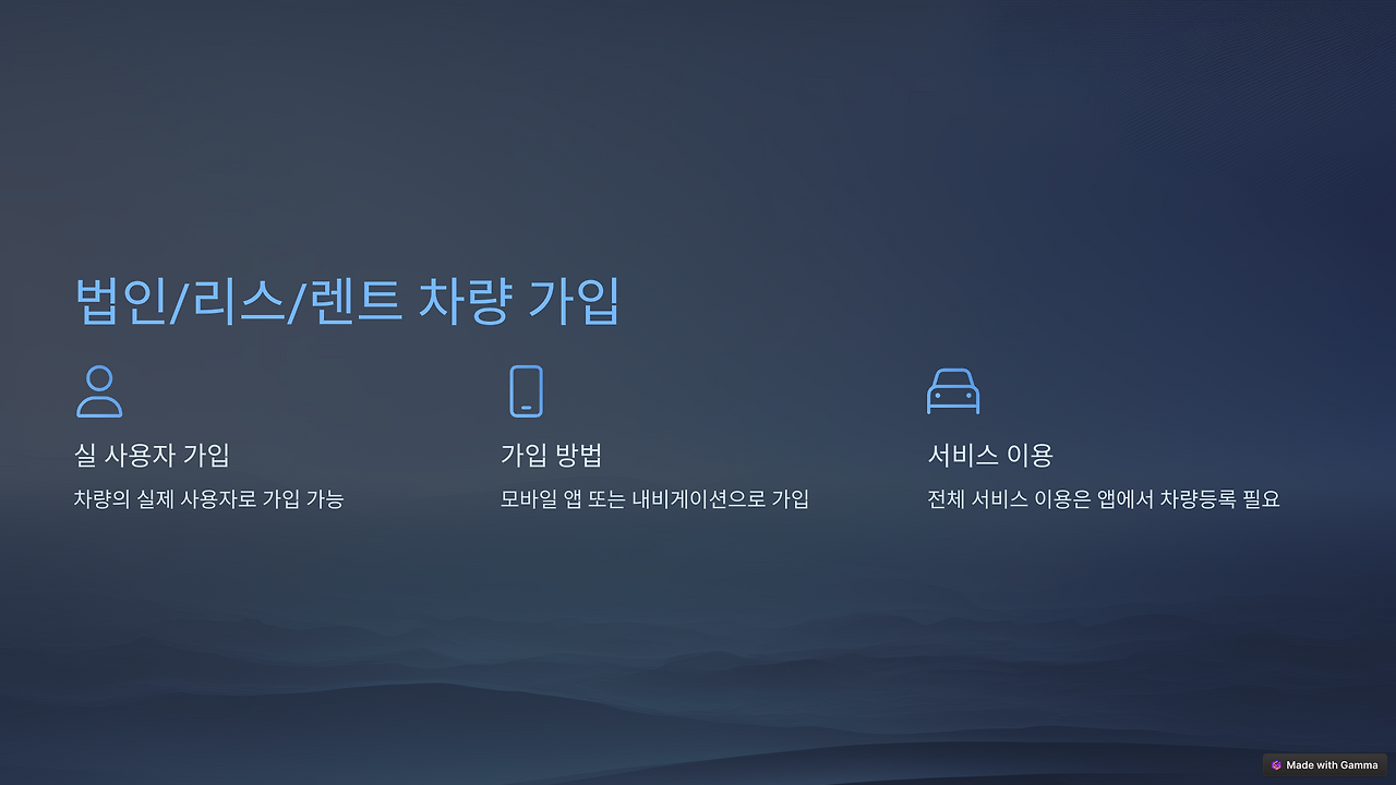 - **법인/리스/렌트 차량**: 법인 사용자도 모바일 앱을 통해 유료 가입 가능하며, 차량 실 사용자로 서비스 이용 가능.
