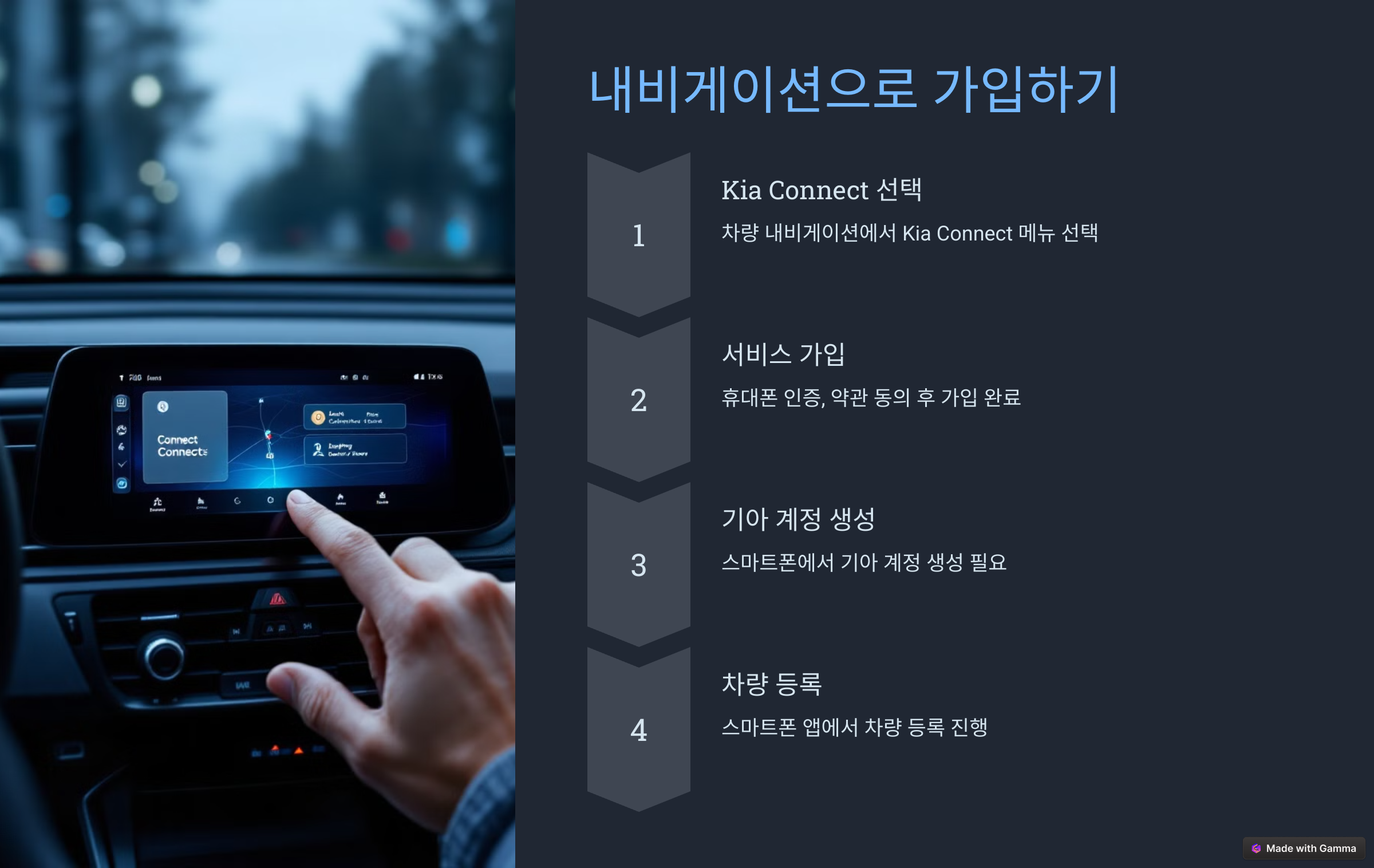 Kia Connect는 스마트폰 앱과 차량 내비게이션을 통해 간편하게 가입할 수 있습니다. 아래 단계에 따라 진행해 보세요: