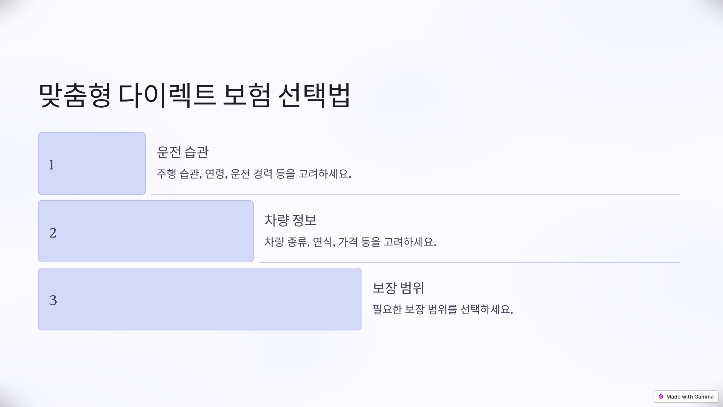 1) 보장 항목 확인: 다이렉트 보험은 최소한의 보장으로 설계된 경우가 많아, 대인·대물 보장 한도와 자손/자상 보장 여부를 꼼꼼히 확인해야 해요. 차량 손해 보장 항목(자차 보험)도 선택적으로 추가하는 것을 추천드려요.