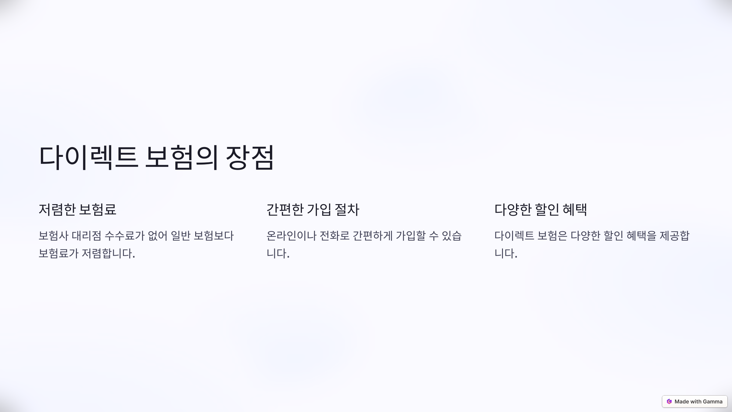 1) 저렴한 보험료: 설계사 수수료나 운영 비용이 절감되기 때문에 보험료가 대리점을 통해 가입하는 상품보다 훨씬 저렴해요. 실제로 디렉트 자동차보험은 일반 상품 대비 10~20%가량 저렴한 경우가 많아요.