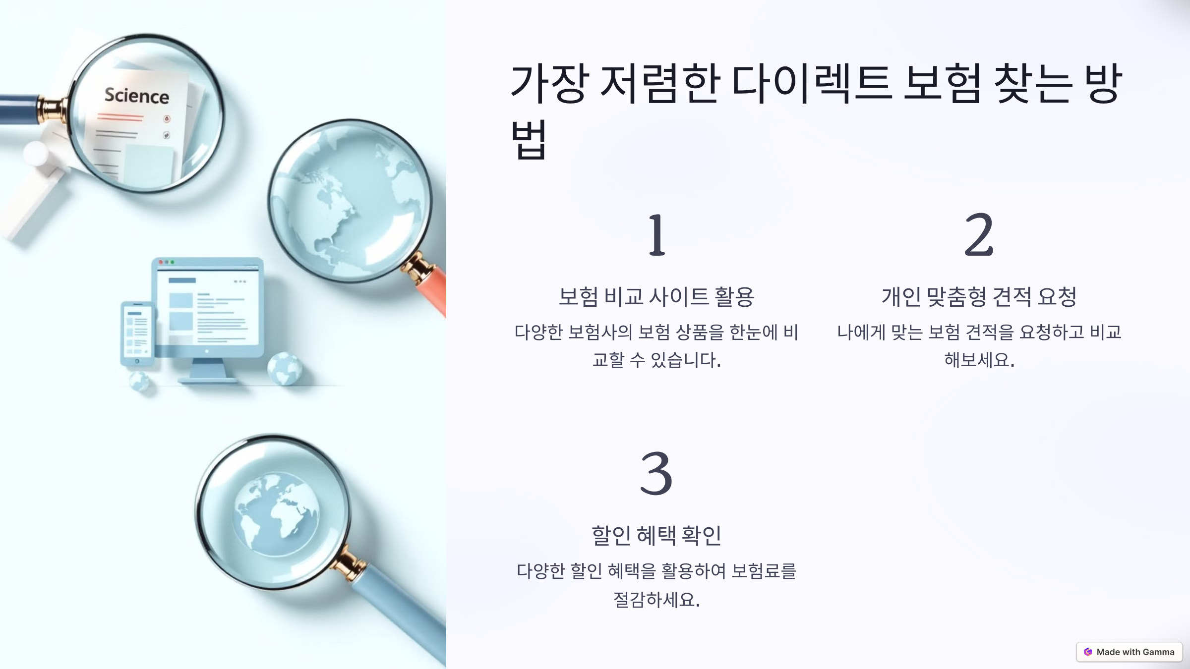 가장 저렴한 다이렉트 보험을 찾으려면 여러 보험사의 견적을 비교하는 것이 필수예요. 주요 다이렉트 자동차보험 제공사로는 삼성화재 다이렉트, 현대해상 하이카 디렉트, DB손해보험 디렉트 등이 있어요. 각사의 공식 홈페이지나 앱을 이용하면 무료로 견적을 받아볼 수 있어요.