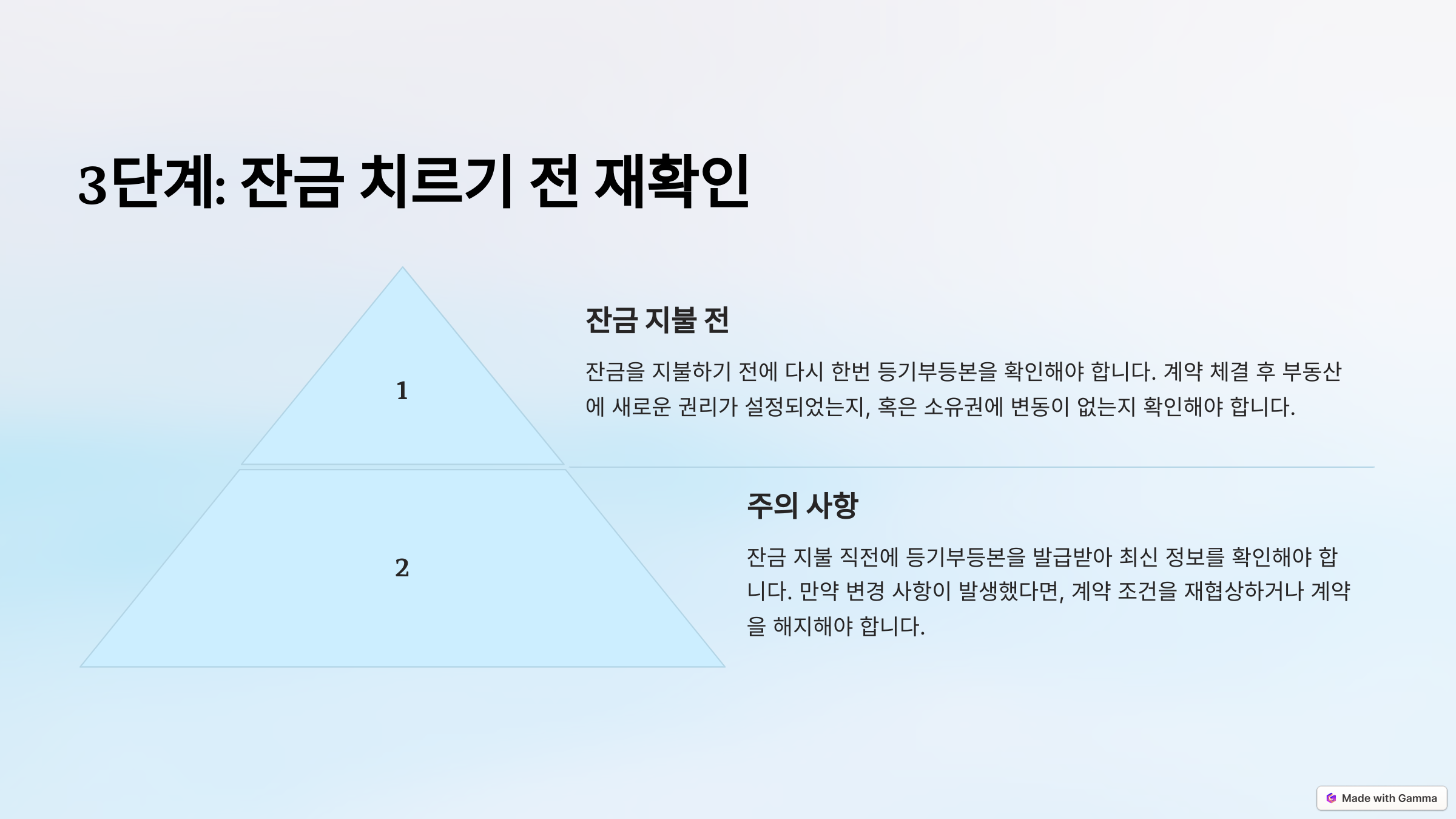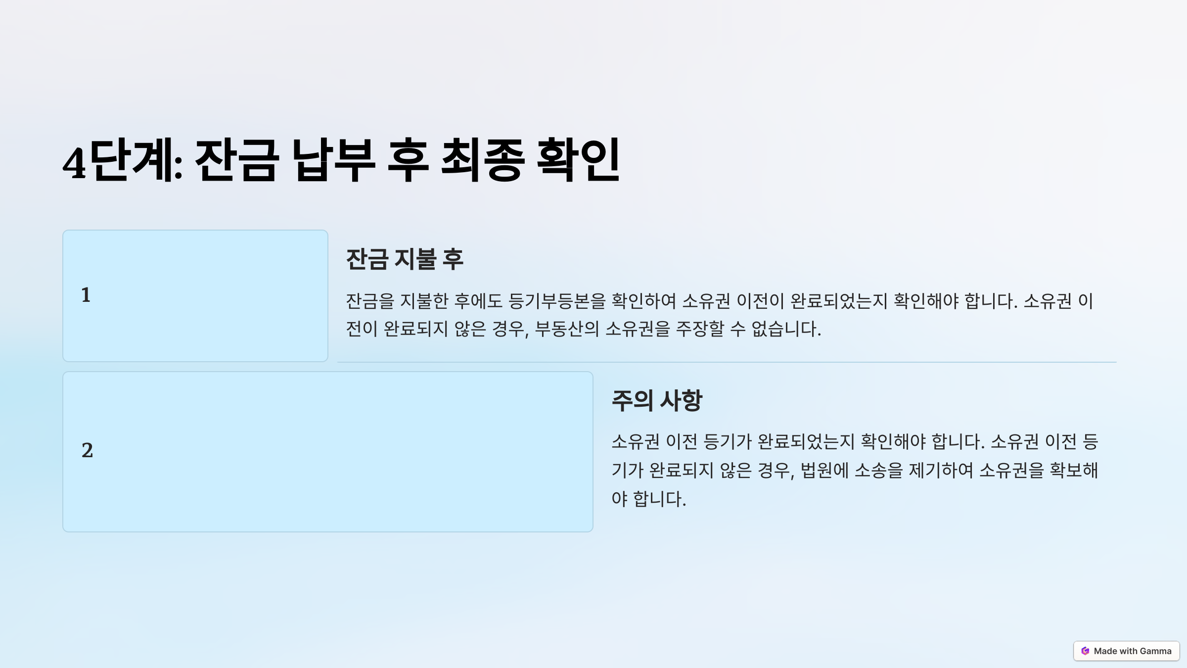 잔금 지급은 거래의 마지막 단계이기 때문에, 이 단계에서 확인을 소홀히 하면 재정적으로 큰 피해를 볼 가능성이 있어요. 잔금 지급 직전에는 최신 등기부등본을 발급받아 모든 항목을 검토하세요.