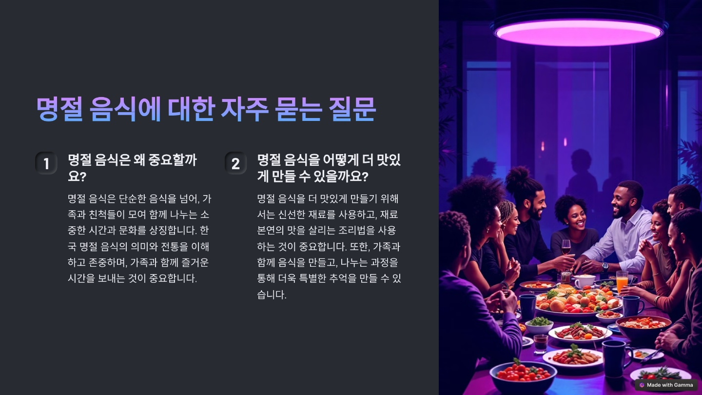 명절 음식은 한국의 전통과 문화를 반영하는 중요한 요소입니다. 각 지역의 고유한 음식은 해당 지역의 역사와 문화를 담고 있으며, 현대에는 이러한 전통들이 변하고 발전하고 있습니다. 명절 음식을 이해하는 것은 한국 문화와 전통을 깊이 이해하는 데 큰 도움이 됩니다.