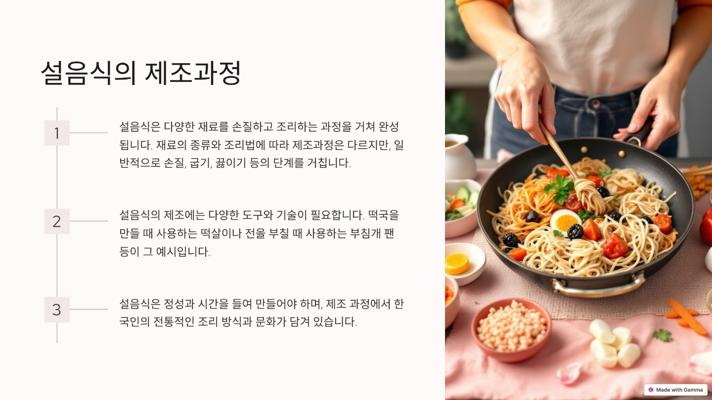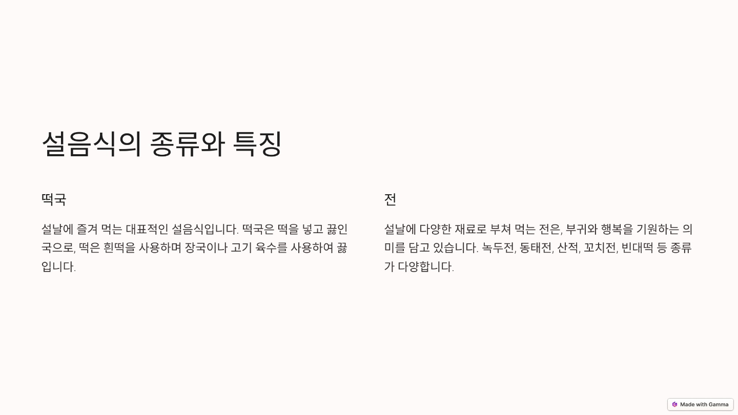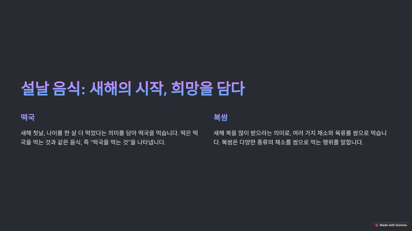설날 음식은 주로 조상에게 차례를 지내고 가족이 모여서 먹는 음식을 말해요. 대표적인 음식으로는 떡국, 전, 나물, 과일 등이 있어요.