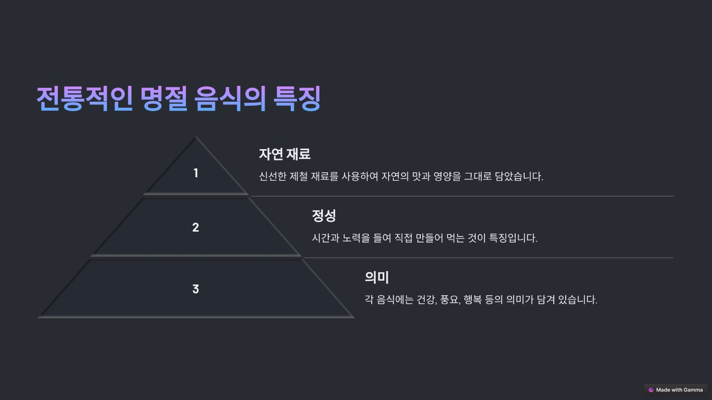전통적인 명절 음식에는 떡, 전, 나물, 찌개, 과일 등이 있어요. 이 음식들은 모두 풍성함과 번영을 기원하는 의미를 담고 있으며, 가족과 함께 나누는 중요한 의미를 지니고 있어요.