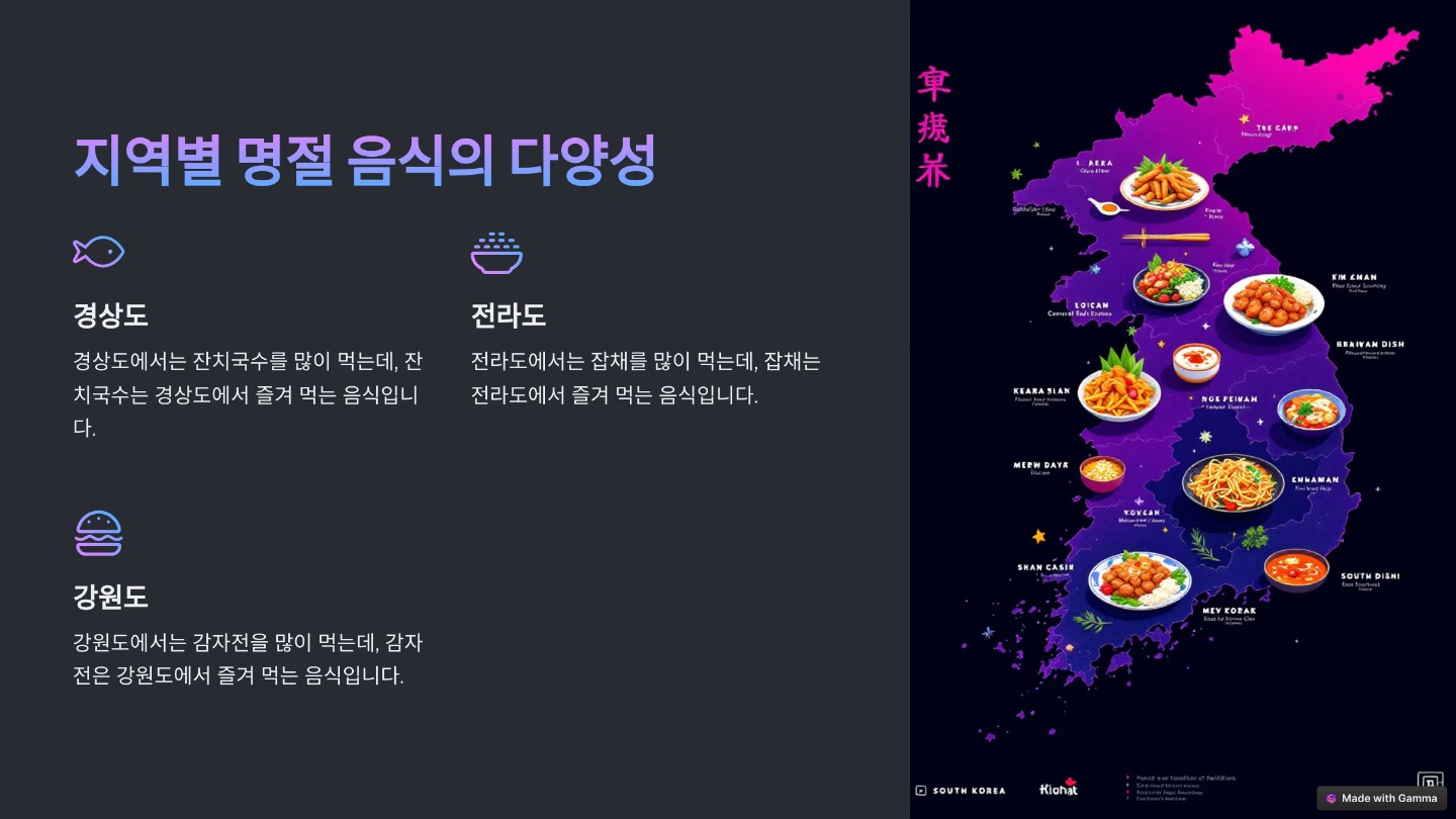 한국의 명절 음식은 지역별로 차이가 있어요. 각 지역의 풍습, 특산물, 기후 등에 따라 음식의 종류와 조리법이 다르답니다.