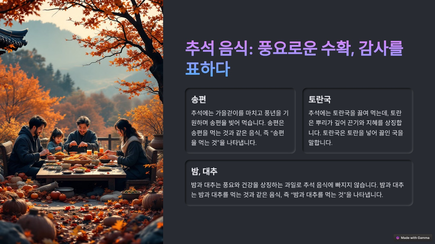 추석은 수확의 기쁨을 나누는 명절이에요. 이때의 음식은 한 해의 풍성한 수확을 상징하는 음식들이 많아요. 추석 음식의 대표적인 예로는 송편, 한과, 전, 나물, 각종 과일 등이 있어요.