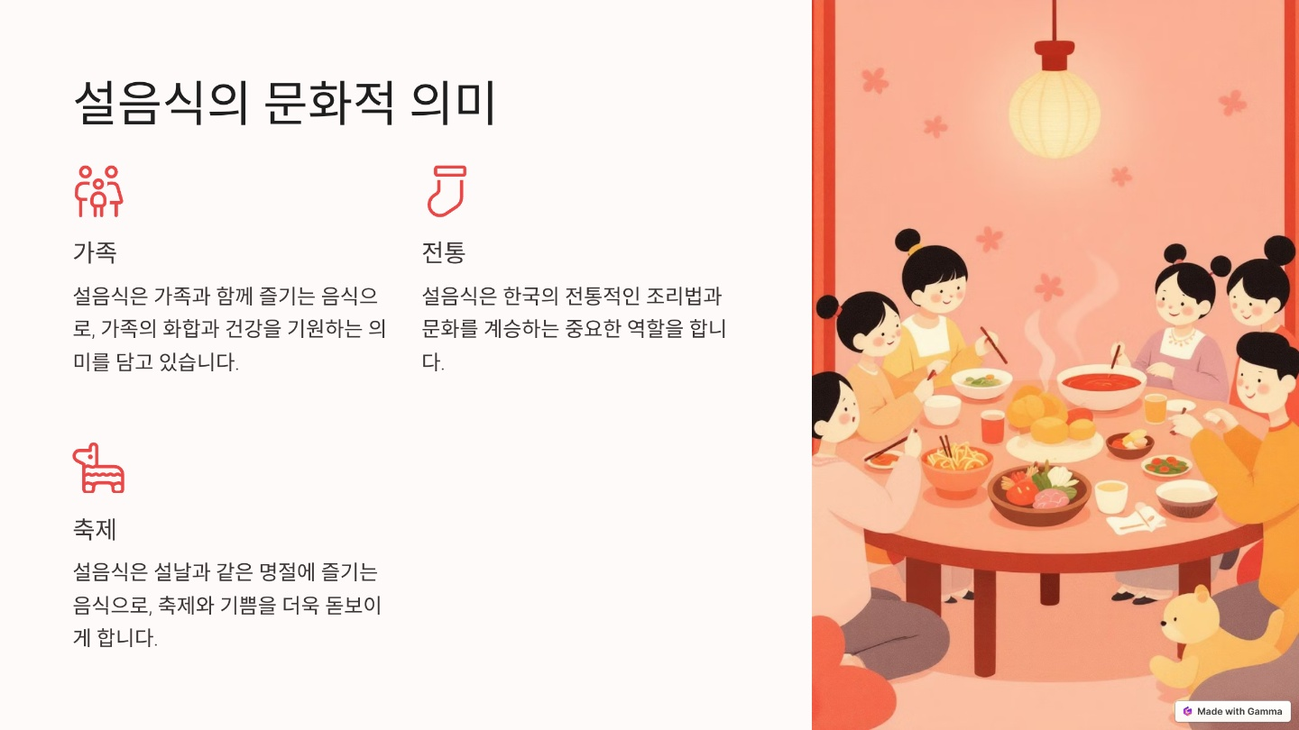 떡국은 설날에 먹는 전통적인 음식으로, 한 해의 첫 번째 음식으로 의미를 담고 있어요. 떡국을 먹으면 나이가 한 살 더 먹는다고 전해져요. 떡국에 들어가는 떡은 가래떡으로, 긴 형태가 장수와 번영을 의미한다고 해요.