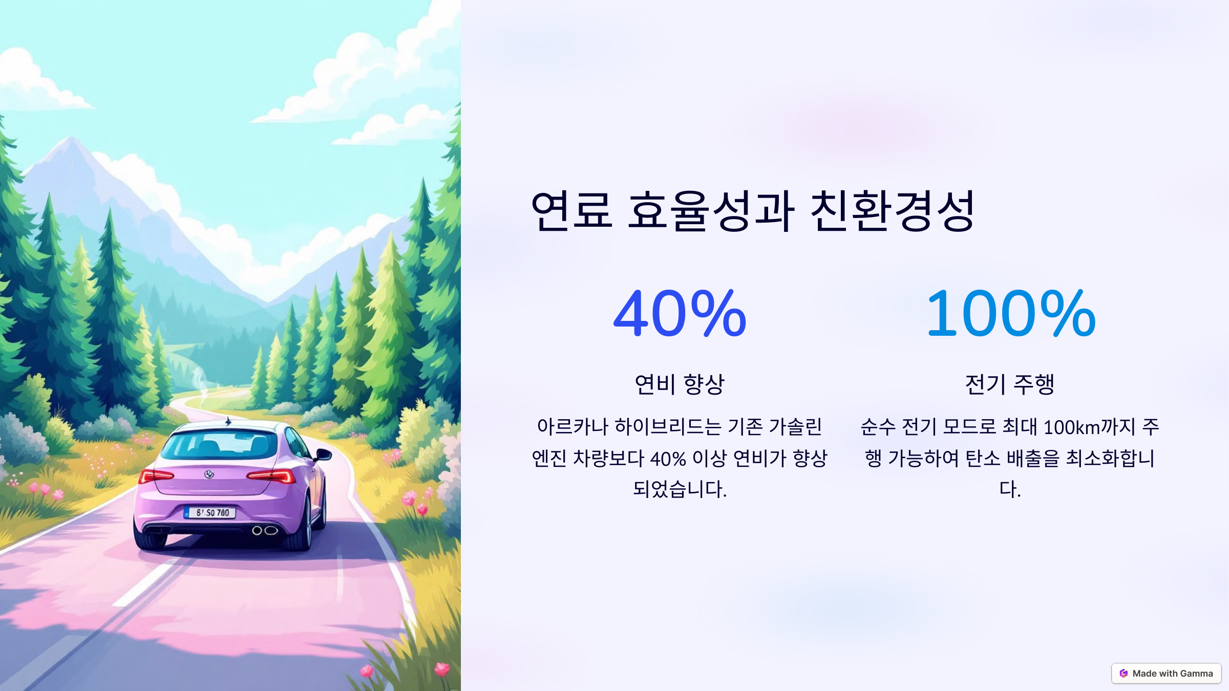 아르카나 하이브리드는 경제성 면에서도 놀라운 가치를 제공해요. 하이브리드 시스템을 통해 연료 비용이 크게 절감되며, 장기적으로 차량 유지 비용 또한 줄어들게 돼요. 이는 연비가 높은 차량을 선호하는 운전자들에게 큰 매력 포인트랍니다.