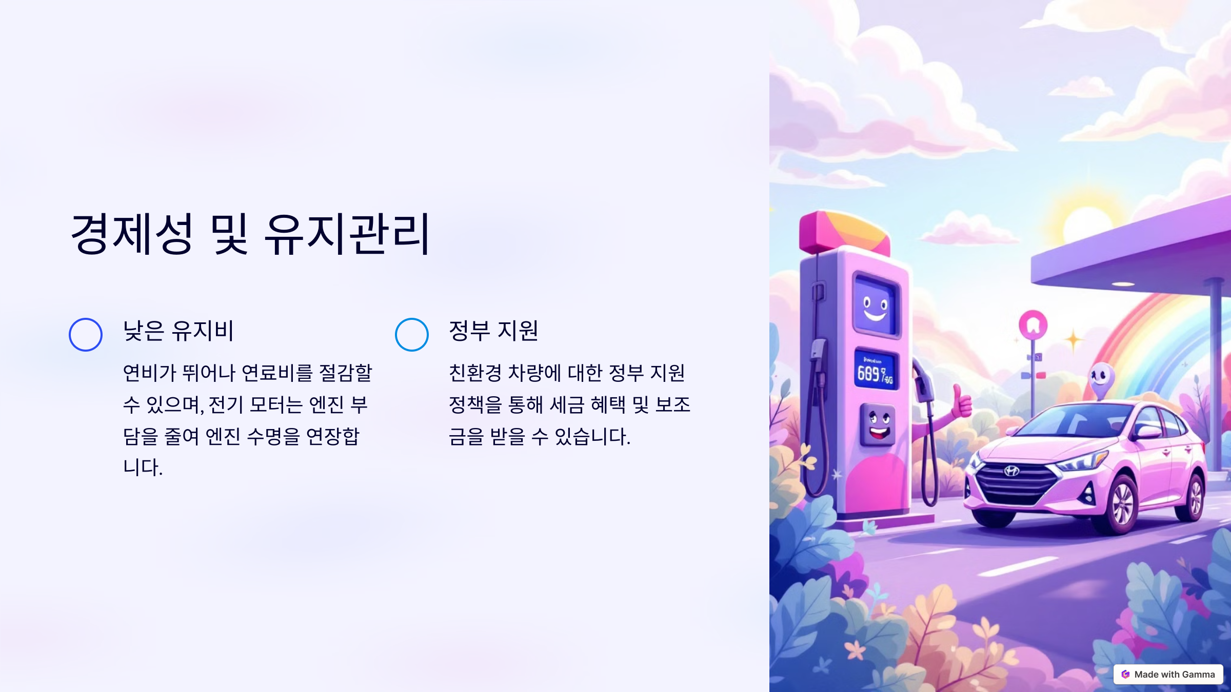 하이브리드 차량은 정부의 친환경 자동차 지원 정책으로 인해 보조금을 받을 가능성이 높아요. 이런 지원 정책은 차량 구매 비용을 크게 줄여주기 때문에 초기 비용 부담을 덜 수 있어요. 따라서 아르카나 하이브리드는 경제적이면서도 친환경적인 선택이랍니다.