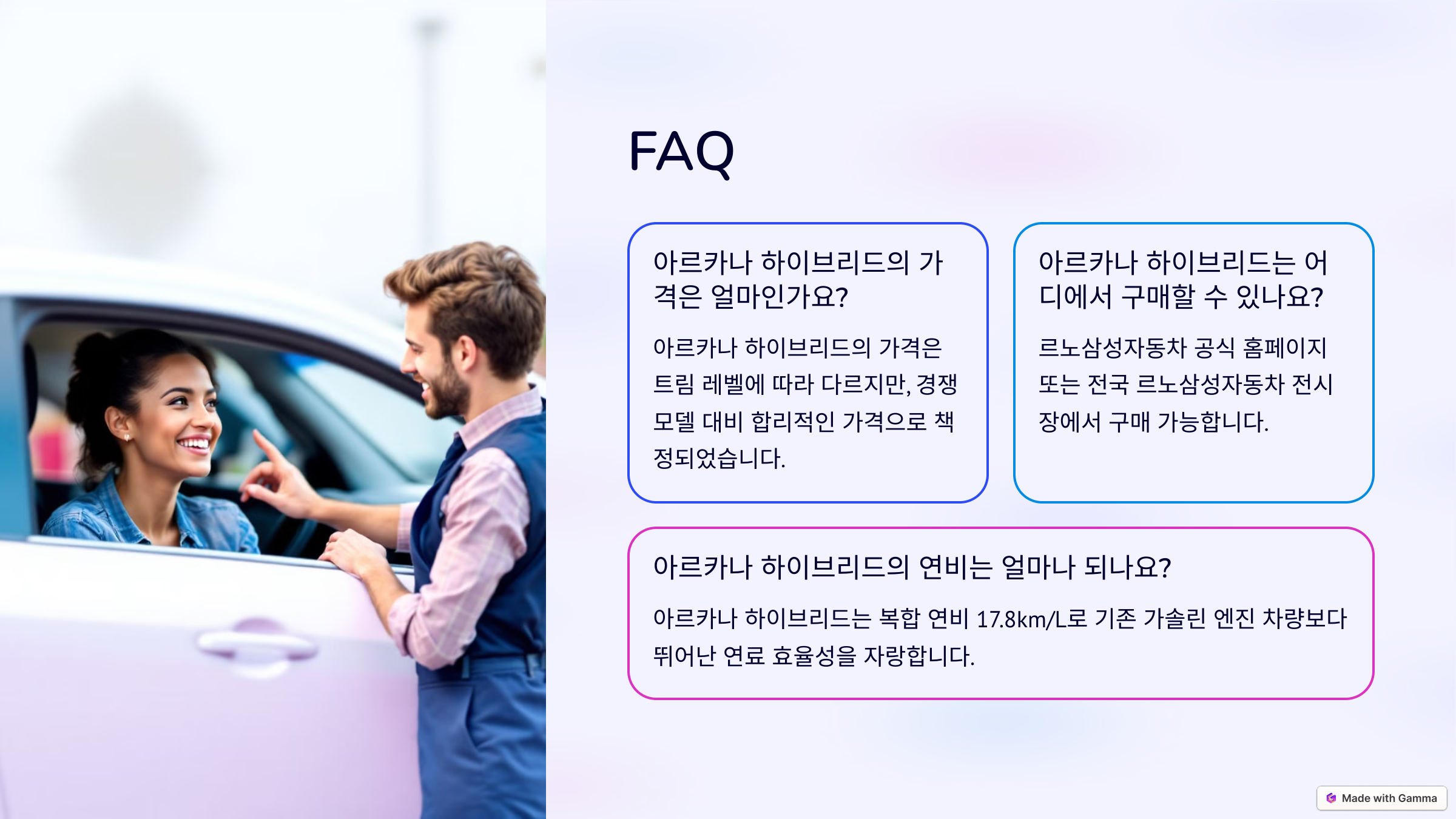 아르카나 하이브리드의 개발 과정은 브랜드의 R&D 센터에서 몇 년에 걸쳐 이루어졌어요. 엔지니어들은 가장 진보된 하이브리드 시스템을 구현하기 위해 다양한 시험과 실험을 반복하며 이 모델을 완성했답니다. 이처럼 아르카나는 단순히 자동차가 아니라, 새로운 세대를 위한 모빌리티 설루션으로 평가받고 있어요.