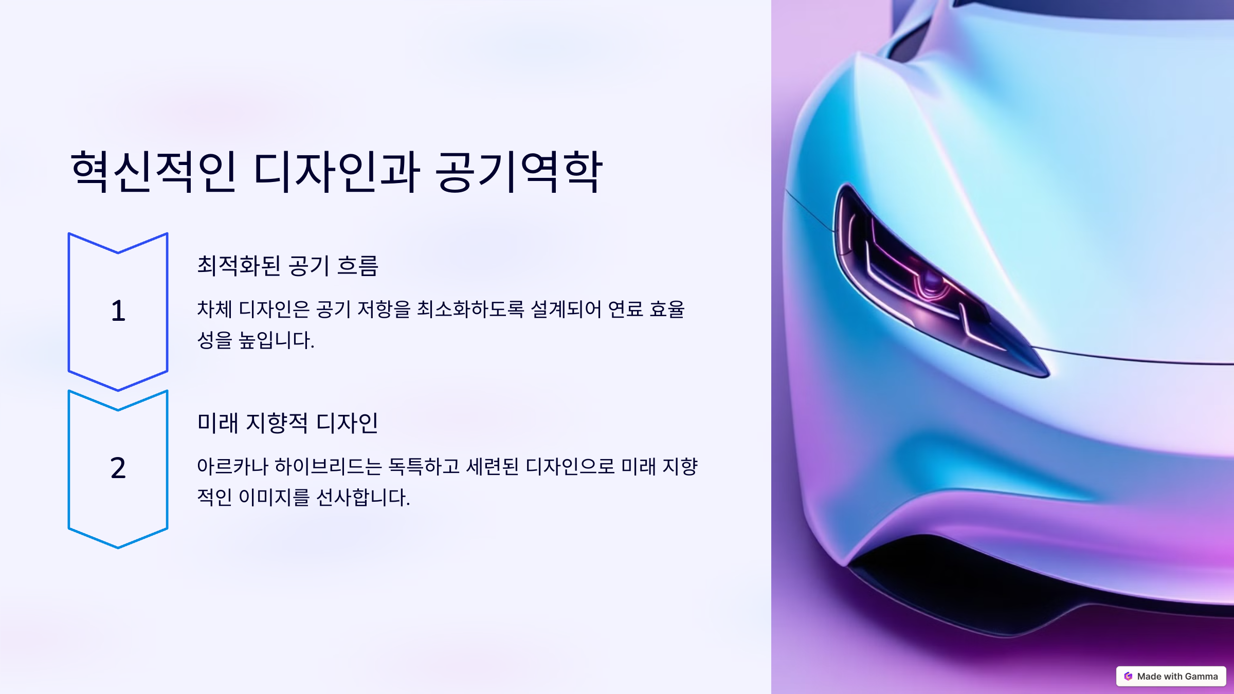 아르카나 하이브리드는 하이브리드 기술의 진보를 보여주는 대표적인 차량이에요. 이 모델은 경제성과 친환경성을 모두 잡아낸 혁신적인 자동차로, 전통적인 내연기관과 전기 모터의 조화를 통해 효율성을 극대화했답니다. 아르카나는 디자인, 성능, 지속 가능성을 동시에 고려한 차세대 교통수단으로 주목받고 있어요.