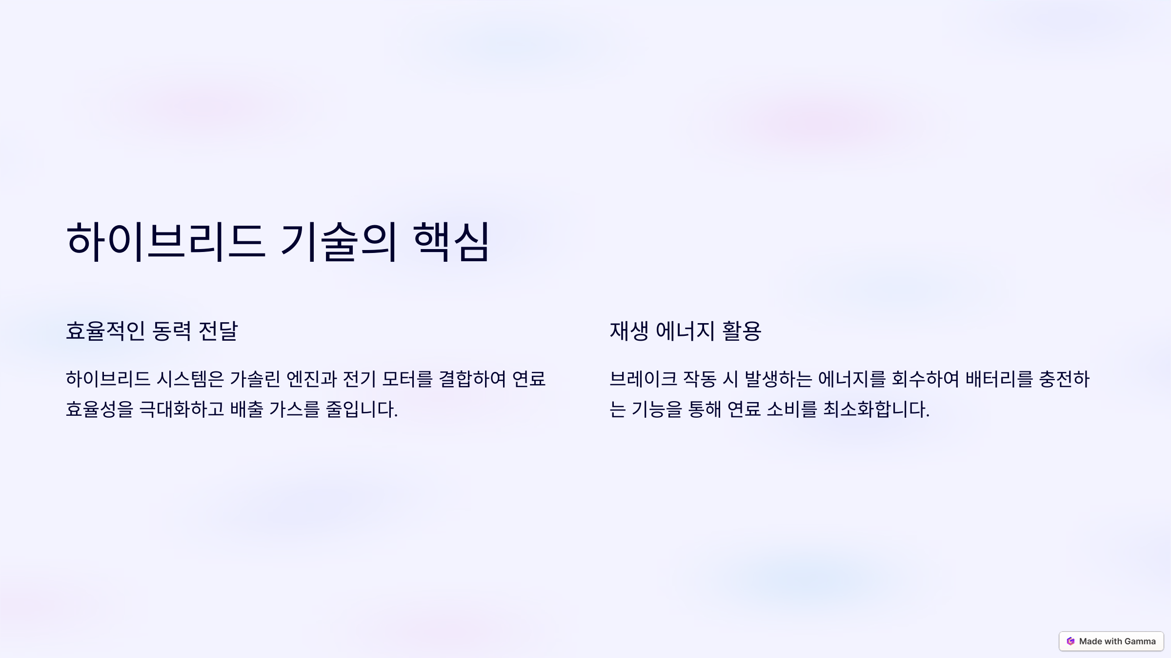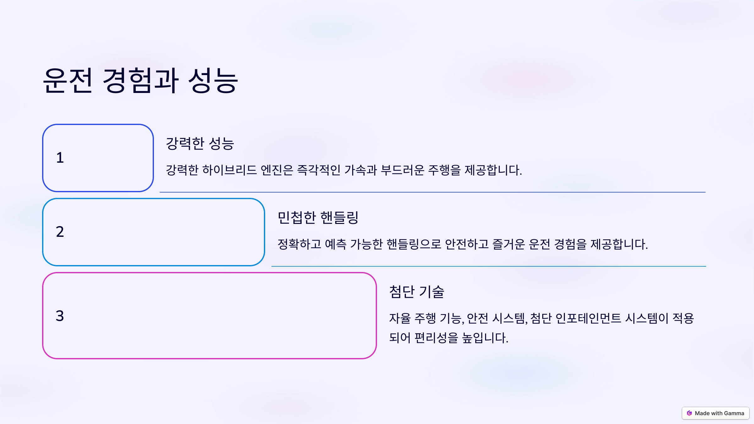 또한, 엔진과 모터의 전환이 매우 부드럽게 이루어져서 운전자가 전환 과정을 거의 느낄 수 없다는 점도 놀라운 특징이에요. 이는 최첨단 소프트웨어와 하드웨어의 조화를 통해 가능한 결과예요.