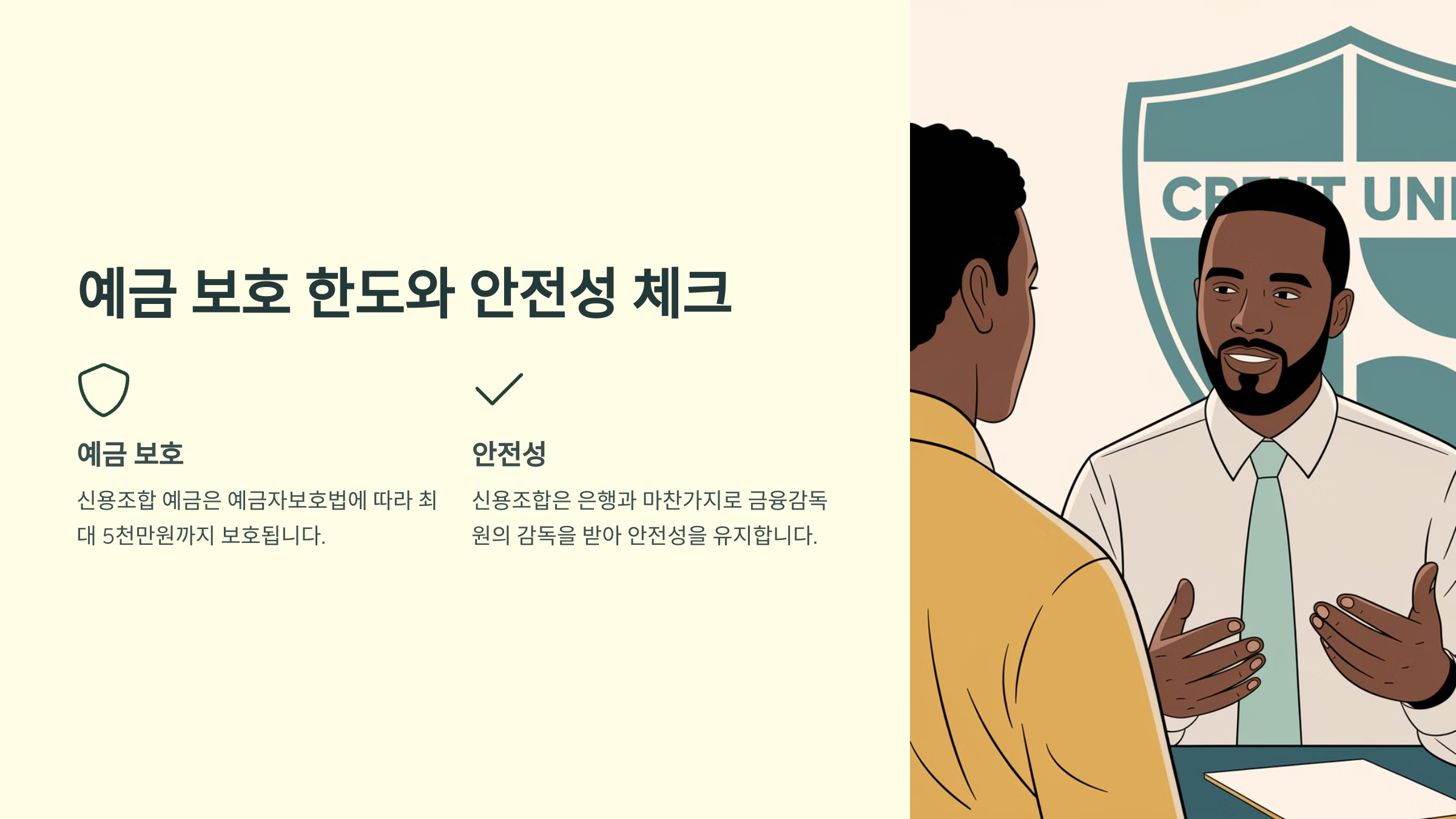 우리나라에서는 '예금자보호법'에 따라 신용조합 예금도 보호되며, 예금보험공사(예보)가 보증하는 한도가 있어요. 현재 보호 한도는 1인당 최대 5천만 원까지예요. 이 금액을 초과하는 예금은 보호되지 않으니, 분산해서 예금하는 것도 하나의 전략이에요. 📊