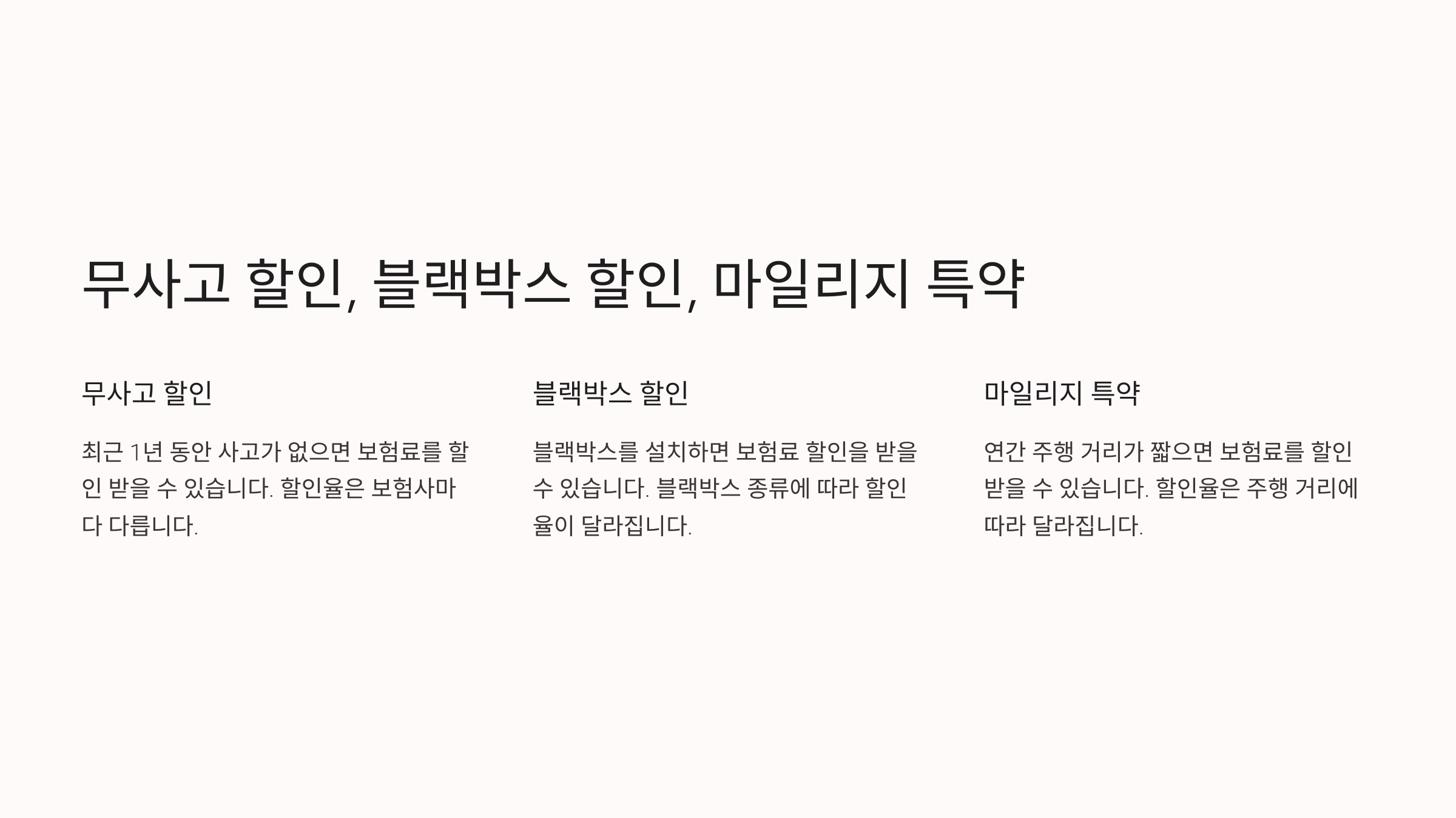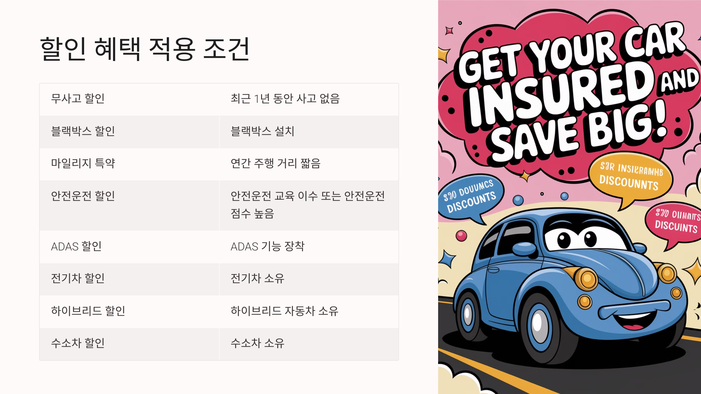 이번 글에서는 자동차보험의 대표적인 할인 특약에 대해 알아볼게요. 무사고 운전자의 보상, 블랙박스 설치의 혜택, 주행거리에 따른 할인, 그리고 친환경차 보험까지 각 특약의 장점을 자세히 살펴보도록 해요.
