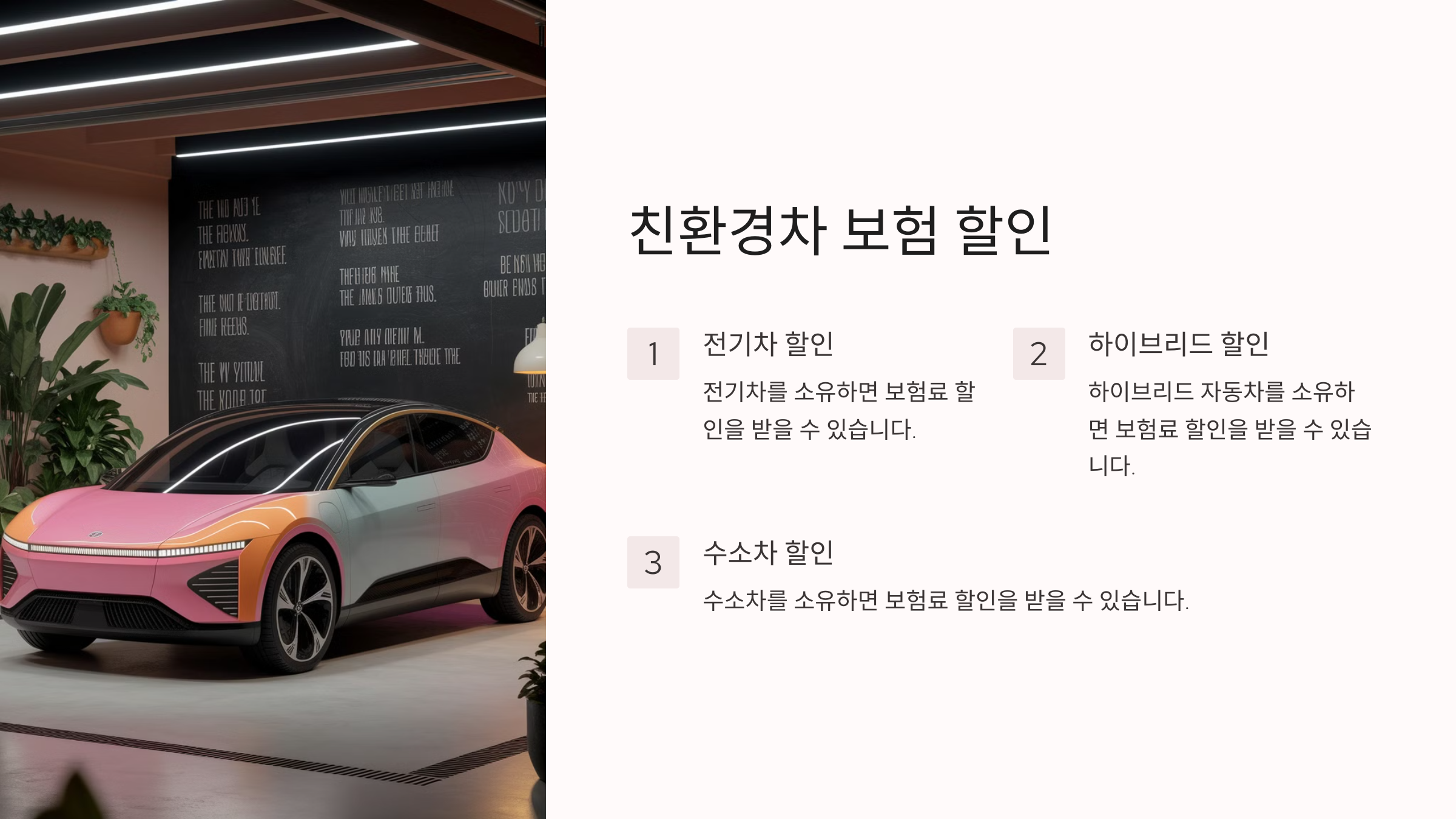 최근 전기차, 하이브리드 차량, 수소차와 같은 친환경 차량이 인기를 끌면서 친환경차 보험 할인도 주목받고 있어요. 친환경 차량은 일반 차량에 비해 탄소 배출량이 적고, 유지비용도 저렴한 장점이 있죠.
