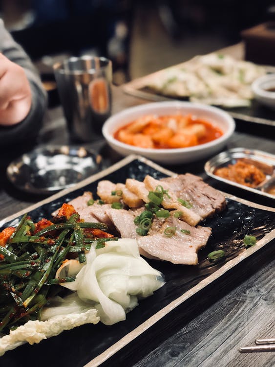 김치삼겹살: 고기와 김치의 조화로 풍미가 살아납니다.