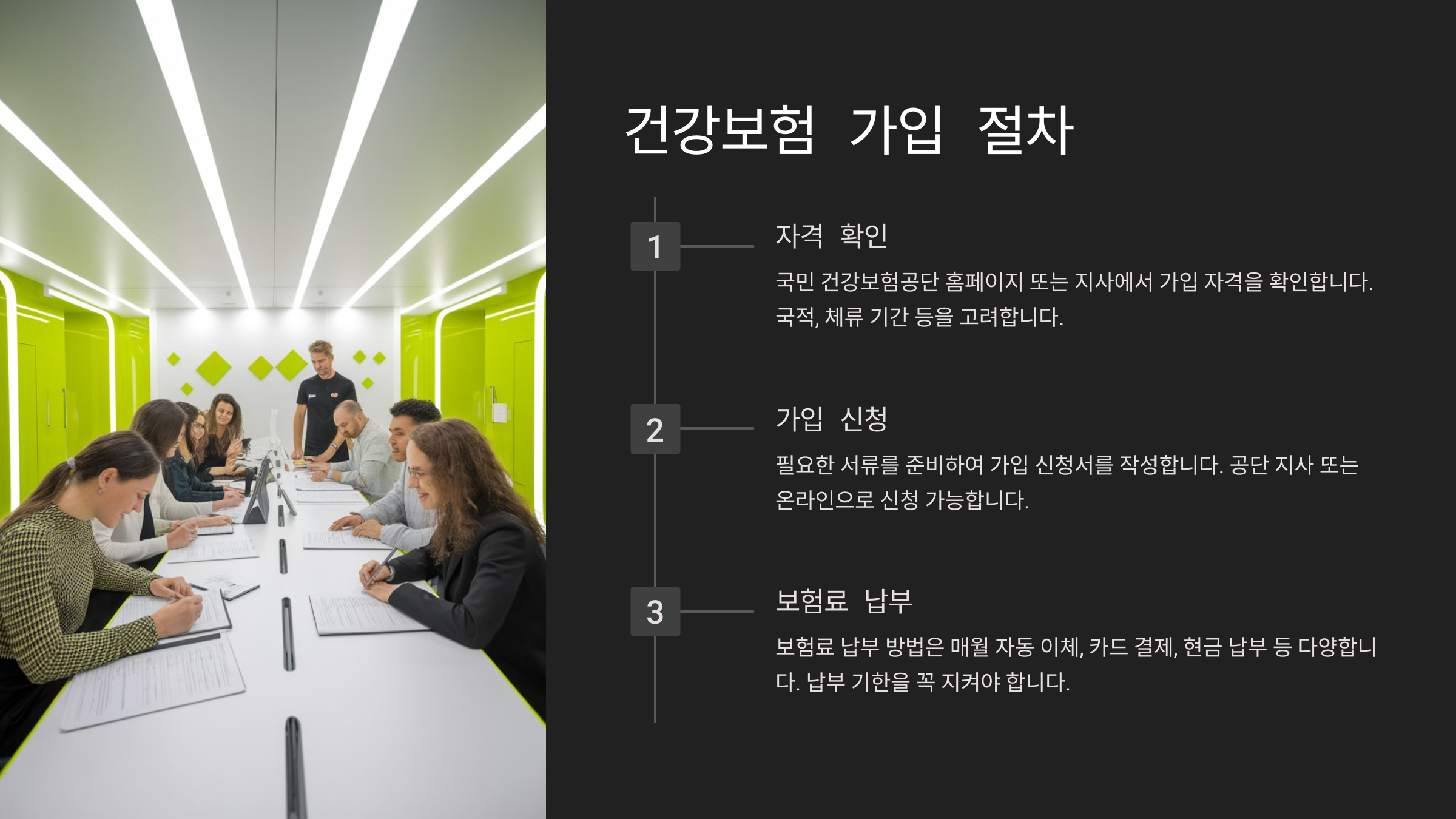 2. 지역가입자: 자영업자나 무소득자는 국민건강보험공단에 직접 방문하거나 온라인으로 가입해야 해요. 소득과 재산에 따라 보험료가 산정돼요.