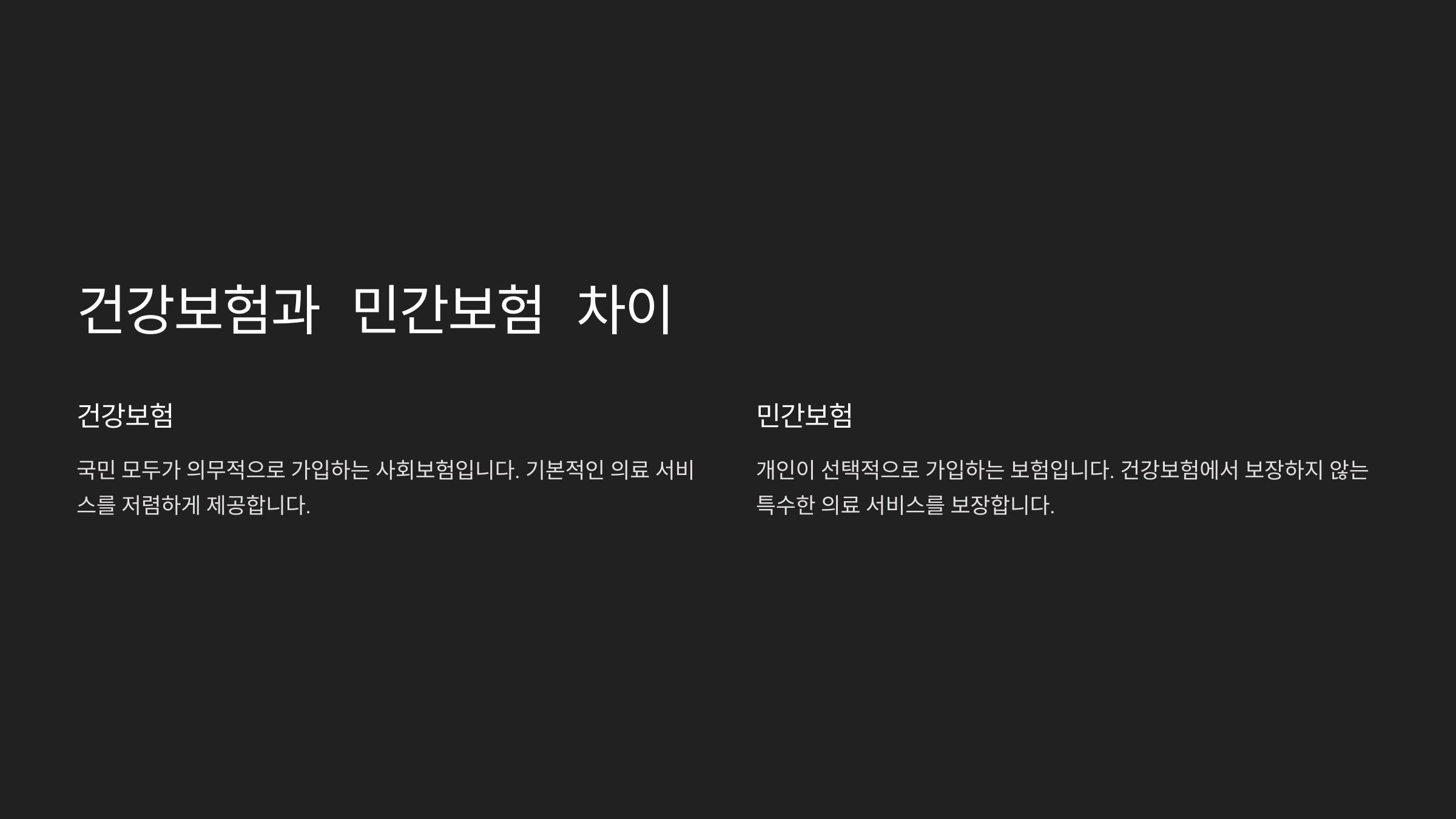 1. 운영 주체: 건강보험은 국가에서 운영하며, 민간보험은 보험사가 운영하는 상업적 보험이에요.