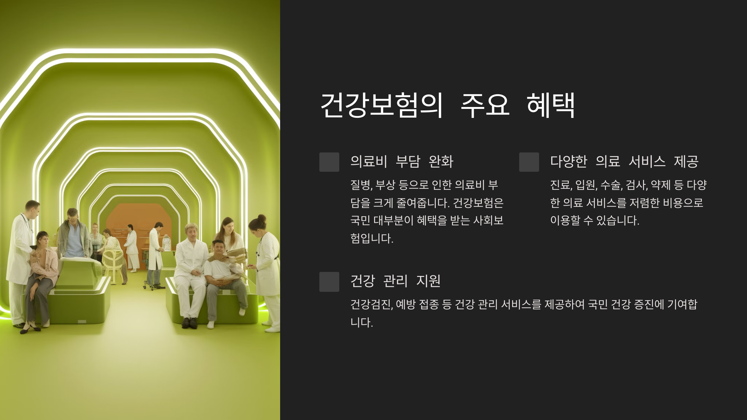건강보험은 다양한 의료 혜택을 제공하여 국민의 의료비 부담을 크게 줄여줘요. 주요 혜택은 다음과 같아요:
