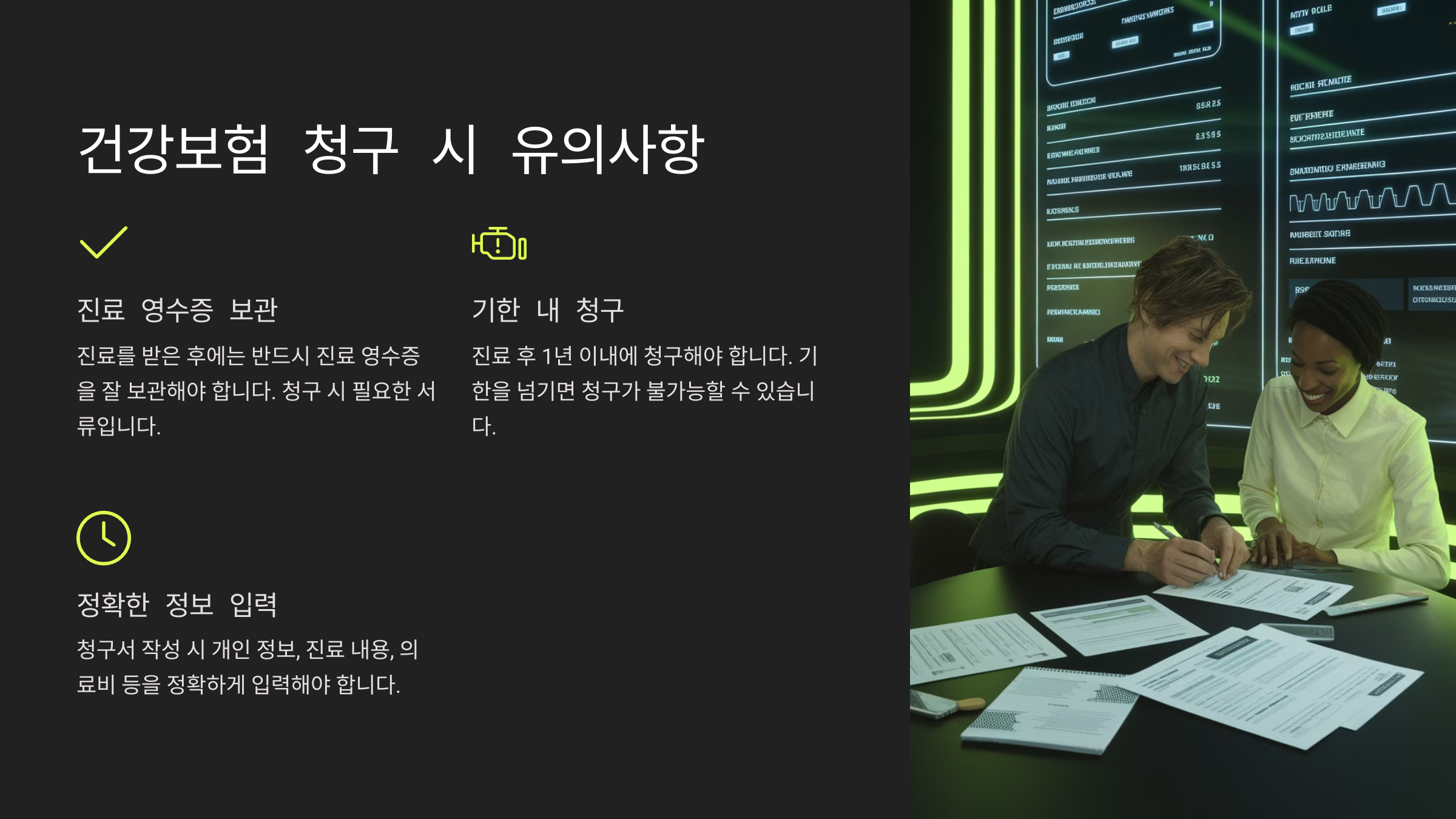 건강보험 혜택을 받으려면 청구 과정에서 정확하고 신속하게 진행하는 것이 중요해요. 아래 유의사항을 참고하세요: