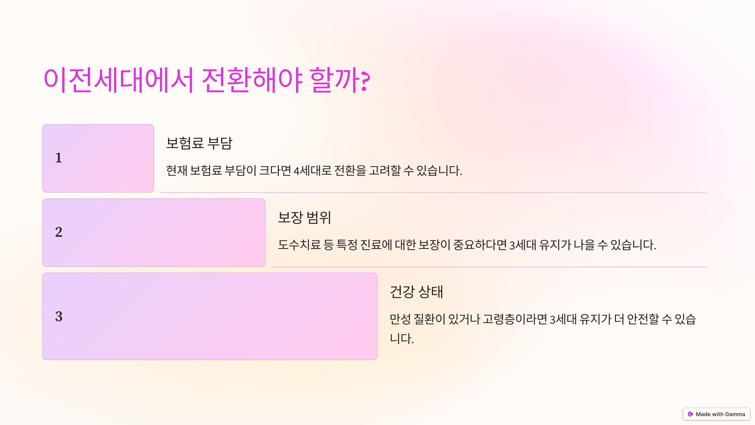 3세대나 4세대로 전환할지 고민이 될 수 있어요. 기존 실손보험은 보장범위가 넓고 자기 부담금이 적지만, 보험료가 지속적으로 인상될 가능성이 크기 때문이에요.